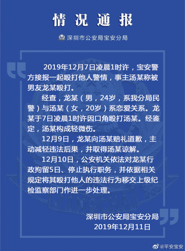 見圳客戶端·深圳新聞網(wǎng)2019年12月12日訊 近日,有媒體報道了深圳女子被男友從家打到樓道,引發(fā)社會廣泛關(guān)注。12月11日,深圳市公安局寶安分局發(fā)布通報稱,家暴施暴男子系寶安分局民警,公安機(jī)關(guān)依法對其行拘5日,停止執(zhí)行職務(wù)。