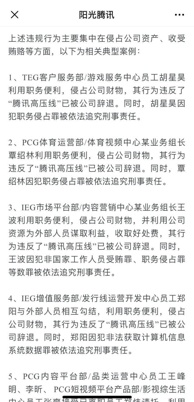 2、PCG體育運(yùn)營部/體育視頻中心某業(yè)務(wù)組長覃紹林利用職務(wù)便利,侵占公司財(cái)物,其行為違反了“騰訊高壓線”已被公司辭退。同時,覃紹林因犯職務(wù)侵占罪被依法追究刑事責(zé)任。