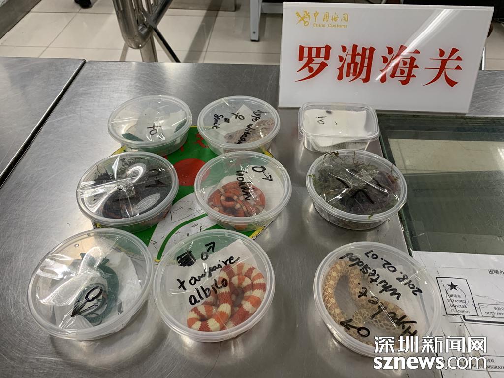 4月19日,一名旅客攜帶洪都拉斯奶蛇、龍紋翡翠蜥蜴等多個(gè)品種合計(jì)9只爬行綱動(dòng)物自羅湖口岸入境,被深圳海關(guān)隸屬羅湖海關(guān)當(dāng)場查獲。