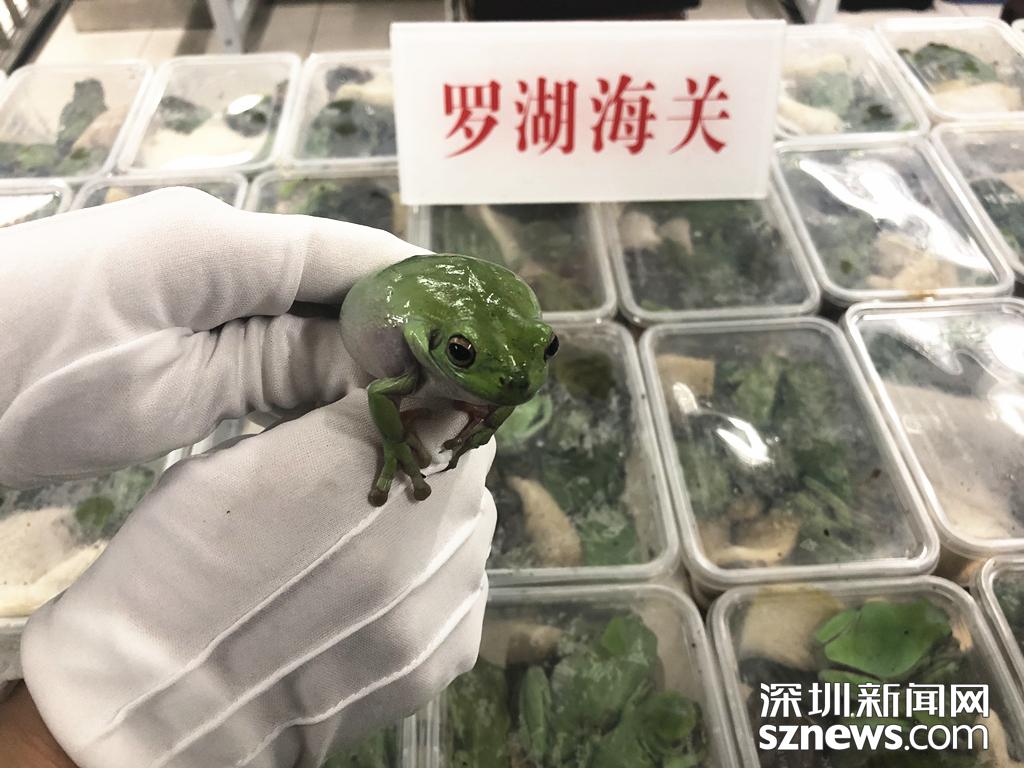 3月21日兩名旅客攜帶670只活體老爺樹蛙入境,被深圳海關(guān)隸屬羅湖海關(guān)當(dāng)場查獲。
