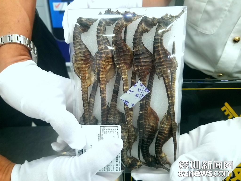 5月19日,一名中國籍旅客從深圳文錦渡口岸入境時(shí),海關(guān)關(guān)員在其行李中共查獲干海馬10只,長度約20公分,總重40克。