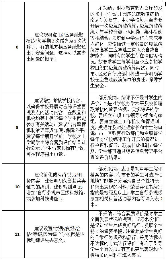市教育局通報指出,在意見征集期間,該局共收到304個郵件及2個信件。市教育局對上述建議進行了統(tǒng)一的分類,這些建議被分成了34類,并組織了專家學(xué)者進行了認真研究。其中,有關(guān)平臺簡化、允許修改更新、建立綜評宣導(dǎo)隊伍等14類建議被采納,另有5類建議被部分采納,余下15類建議沒有被采納。