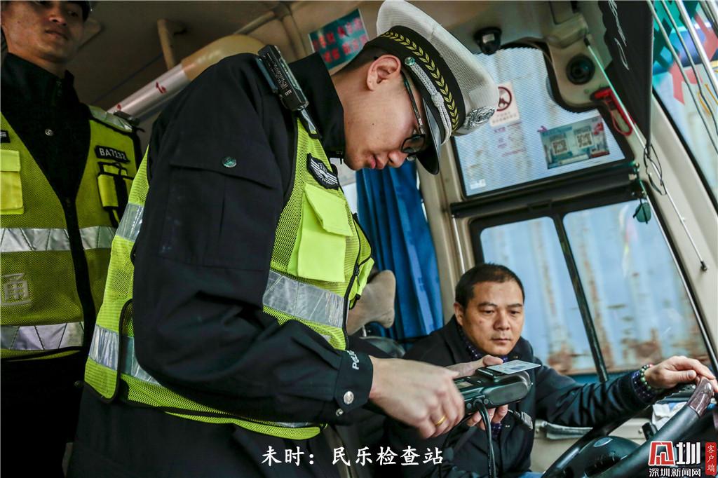 下午14時50分左右,一名深圳交警民警對一輛營運客車司機進行檢查。