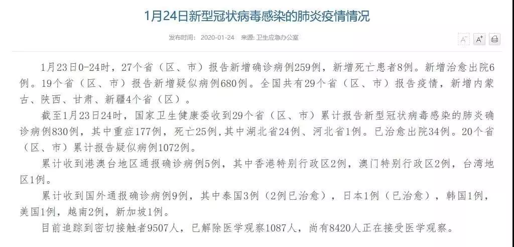 國家衛(wèi)建委通報:1月23日0-24時,27個省(區(qū)、市)報告新增確診病例259例,新增死亡患者8例。新增治愈出院6例。19個省(區(qū)、市)報告新增疑似病例680例。全國共有29個?。▍^(qū)、市)報告疫情,新增內(nèi)蒙古、陜西、甘肅、新疆4個?。▍^(qū))。