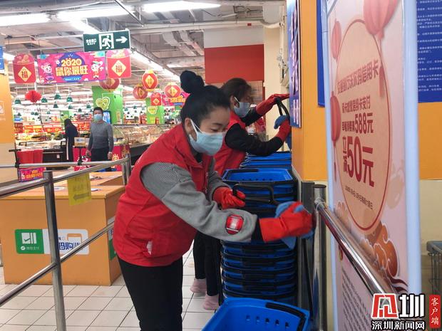 見圳客戶端·深圳新聞網(wǎng)2020年1月31日訊(見圳客戶端、深圳新聞網(wǎng)記者 胡津瑋)戴上口罩、手套,再穿上標(biāo)志性的紅色馬甲,市食藥志愿服務(wù)總隊(duì)的志愿者們紛紛走上超市的各個(gè)崗位,清理貨品、補(bǔ)貨、對(duì)購物車購物籃進(jìn)行清潔消毒、為來購物的市民測(cè)量體溫…據(jù)了解,由于春節(jié)期間各大商超缺少人手,在市市場(chǎng)監(jiān)管局與團(tuán)市委的指導(dǎo)下,市食藥志愿服務(wù)總隊(duì)迅速調(diào)動(dòng)全市在深的食品藥品安全志愿者,成立了由近300名食品藥品安全志愿者組成的春節(jié)“菜籃子”志愿者保障工作小組,為全市各大商超提供志愿服務(wù),全力保障市場(chǎng)供應(yīng)、消除市民顧慮,在防控疫情特殊期間注入了紅馬甲的正能量。記者今天便走訪了深圳的一家超市,尋找這批紅色的身影,了解他們一天的工作。