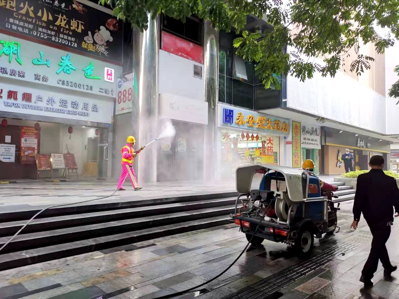 航苑大廈西座位于福田區(qū)華強(qiáng)北街道華航社區(qū),當(dāng)天下午,記者在航苑西座看到,有兩名值班保安在門口嚴(yán)格把關(guān),對(duì)每個(gè)進(jìn)入小區(qū)的住戶進(jìn)行體溫檢測(cè)。一輛灑水車正在圍繞小區(qū)噴灑消毒液。