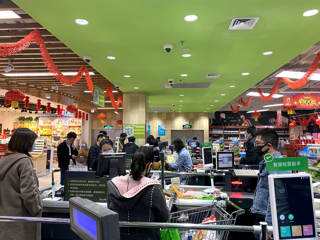 與寂寥的街道相映成趣的是商場(chǎng)內(nèi)排隊(duì)購(gòu)買果蔬的市民