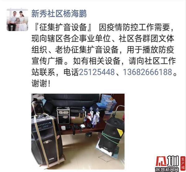 疫情面前,小廣播能發(fā)揮大作用,方便大力宣傳防疫知識(shí)。疫情在不斷蔓延,廣播宣傳任務(wù)任務(wù)緊急,而其中新秀社區(qū)一時(shí)沒(méi)有足夠的擴(kuò)音設(shè)備,于是,立即向居民、社會(huì)團(tuán)體、企業(yè)等發(fā)出征集令。新秀社區(qū)黨委書(shū)記楊海鵬在微信朋友圈發(fā)布了征集信息及聯(lián)系電話(huà)。沒(méi)想到這征集令一發(fā)出,很快就得到了市民朋友的積極響應(yīng)。