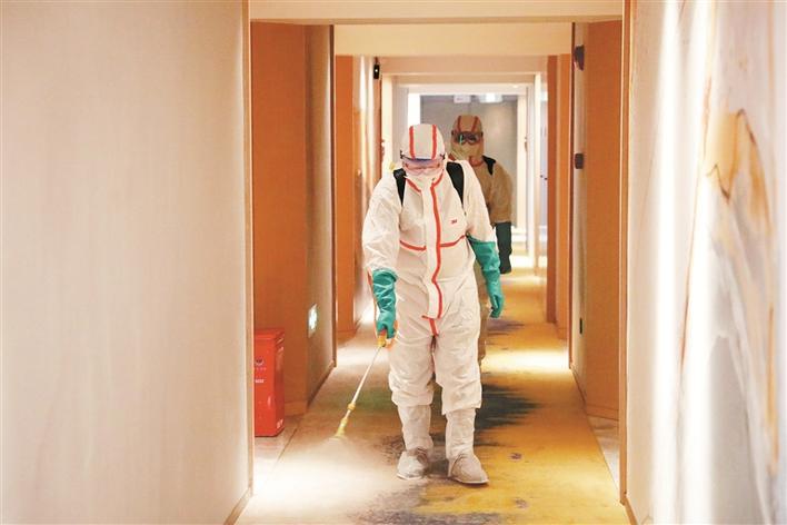 ▲消殺人員對酒店走廊進(jìn)行消殺。
