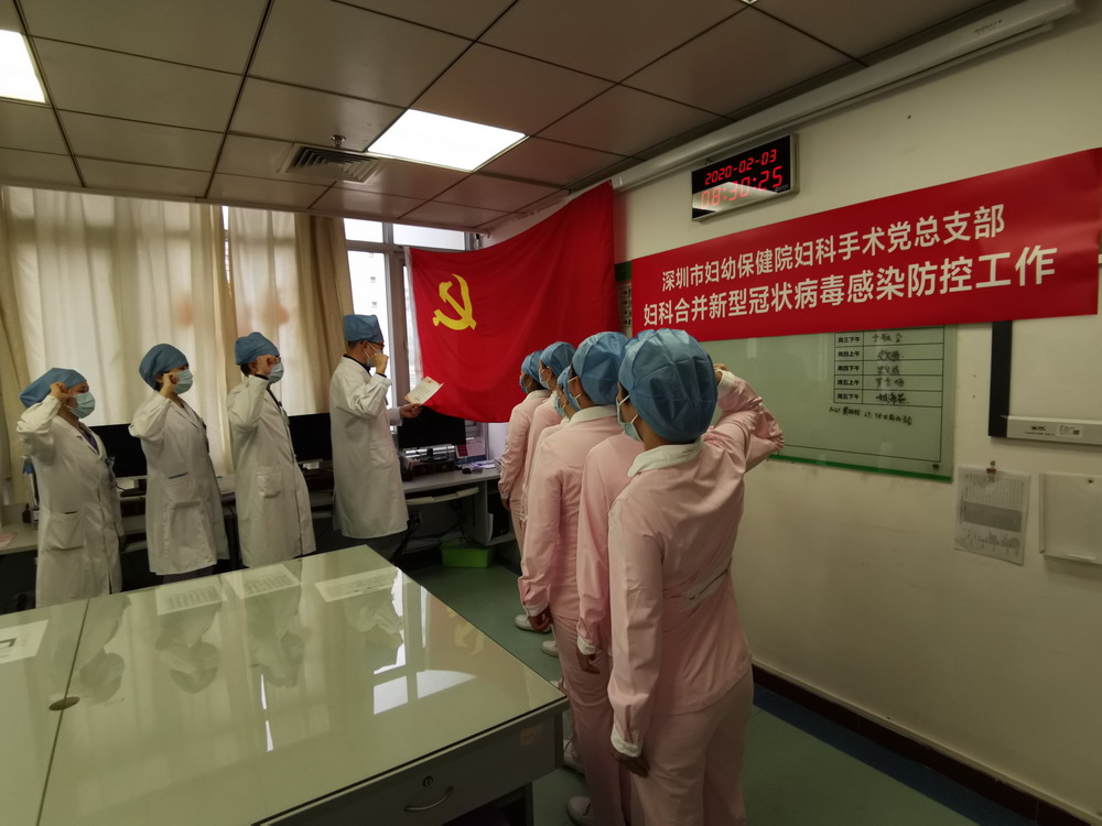 全院黨員干部集體承諾:“在疫情防控重要關(guān)頭,充分發(fā)揮黨員先鋒模范作用,自愿報(bào)名參加支援新型冠狀病毒防控工作,服從醫(yī)院統(tǒng)一安排,履職、擔(dān)當(dāng)、盡責(zé),為防控新冠病毒貢獻(xiàn)自己的力量!”同時(shí),面對(duì)疫情,新成立的妊娠合并新冠防控病區(qū)中的黨員干部在黨旗下莊嚴(yán)宣誓,全力以赴,不辱使命!