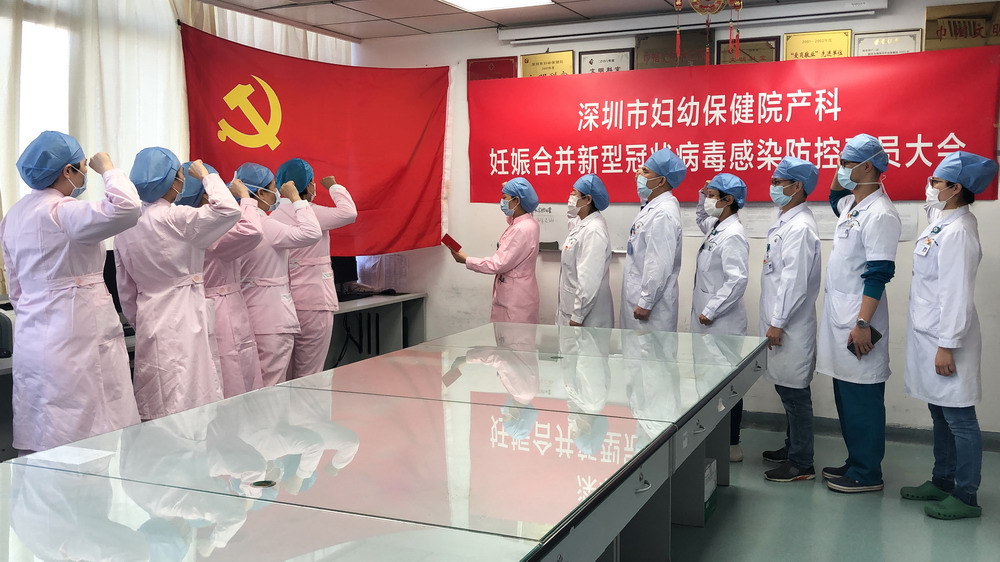 產(chǎn)科自愿參加妊娠合并新冠防控病區(qū)的黨員們,在新成立的病區(qū)重溫入黨誓詞