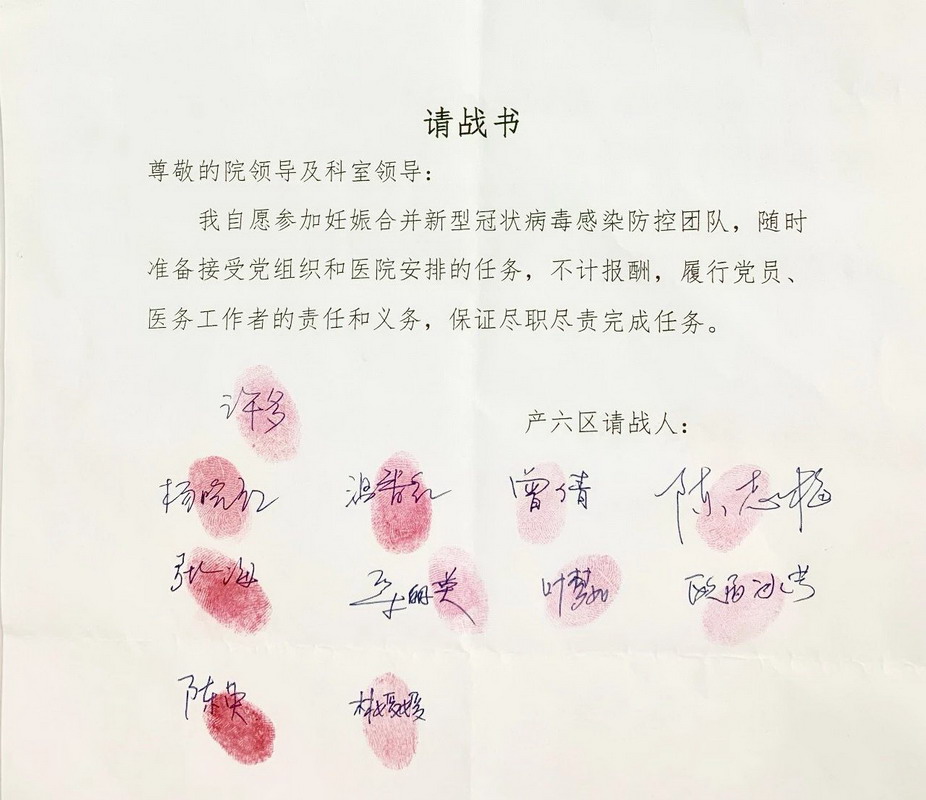 面對(duì)疫情,黨員干部紛紛向科室提交請(qǐng)戰(zhàn)書(shū)并莊嚴(yán)宣誓,志愿參加疫情防控的阻擊戰(zhàn)。產(chǎn)科共收到200多份請(qǐng)戰(zhàn)書(shū),特別是有三名孕婦請(qǐng)纓,令人動(dòng)容。請(qǐng)戰(zhàn)人員組成了三個(gè)防控梯隊(duì),為醫(yī)院妊娠合并新型冠狀病毒感染防控奠定了強(qiáng)大的人力資源保障。