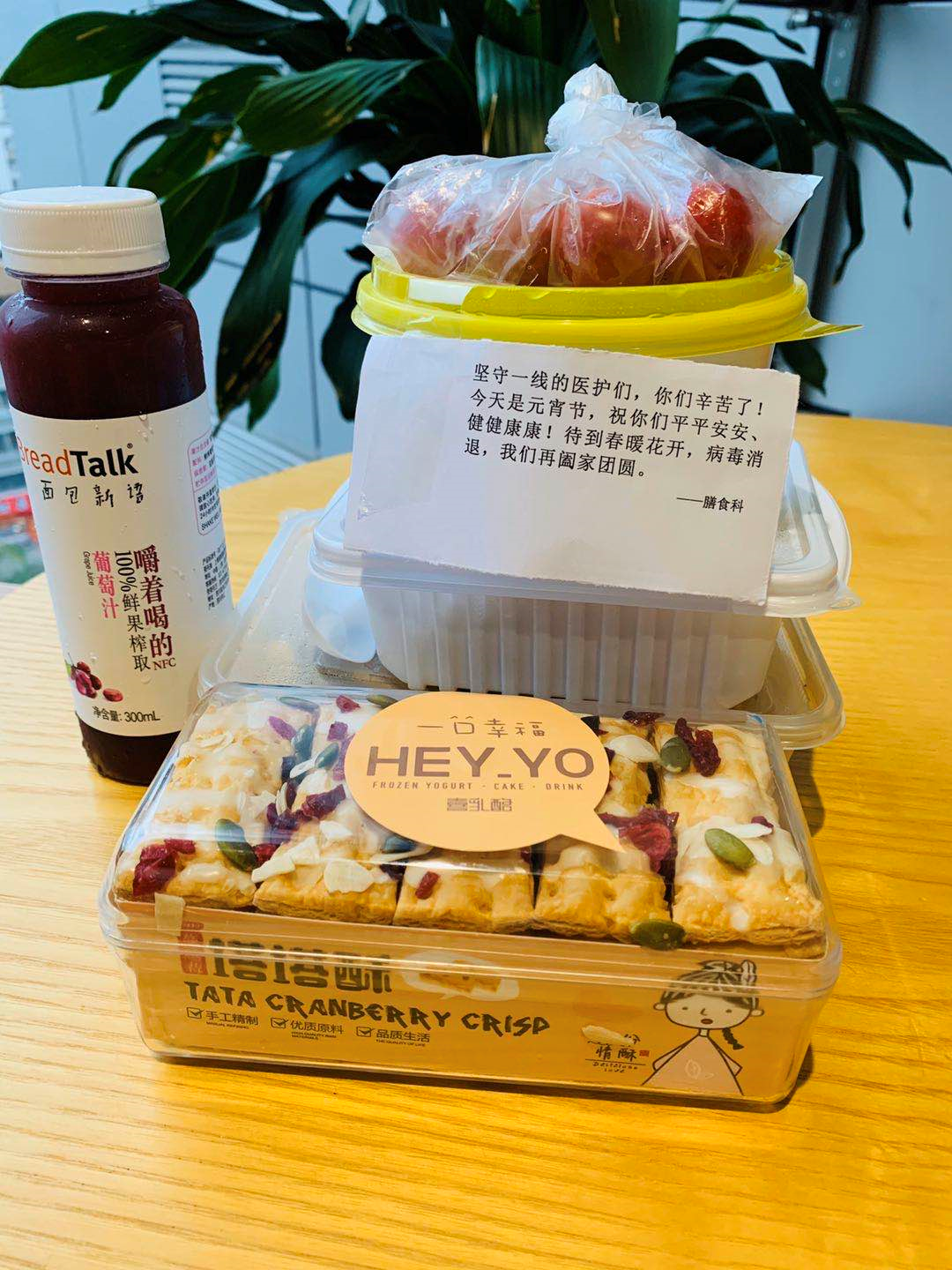 當(dāng)天中午和晚上,發(fā)熱門診、感染科、隔離病房、檢驗(yàn)科等一線的醫(yī)護(hù)人員,除了收到可口的飯菜外,還收到了一碗熱氣騰騰的湯圓。讓他們意外的是,湯圓盒上還貼了溫馨的字條,“堅(jiān)守一線的醫(yī)護(hù)們,你們辛苦了!今天是元宵節(jié),祝你們平平安安、健健康康!待到春暖花開(kāi),疫情消退,我們?cè)訇H家團(tuán)圓。”