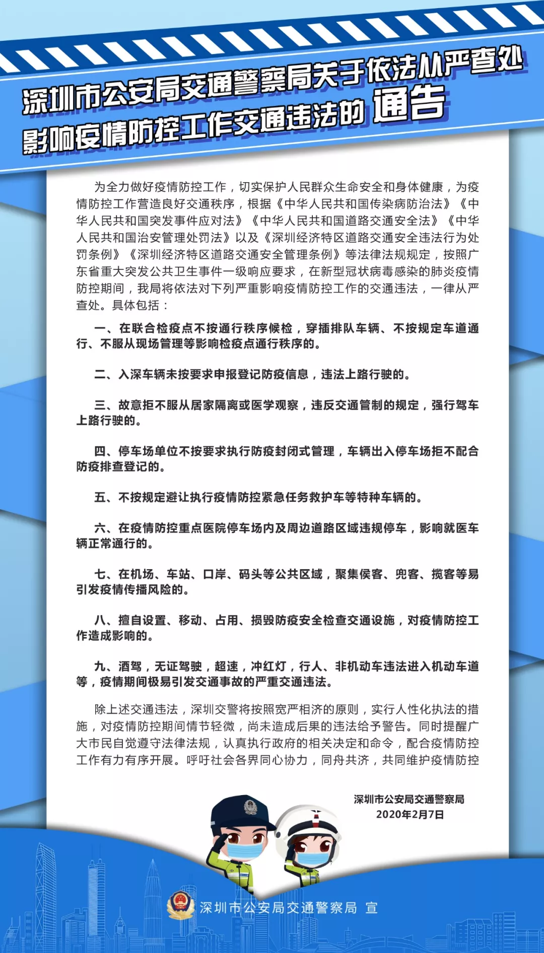 深圳市公安局交通警察局關于依法從嚴查處影響疫情防控工作交通違法的通告