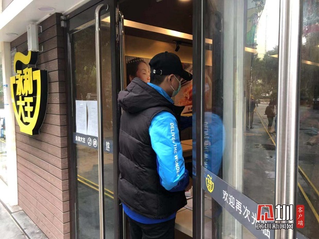 外賣(mài)小哥前來(lái)永和大王店前領(lǐng)取外賣(mài)。