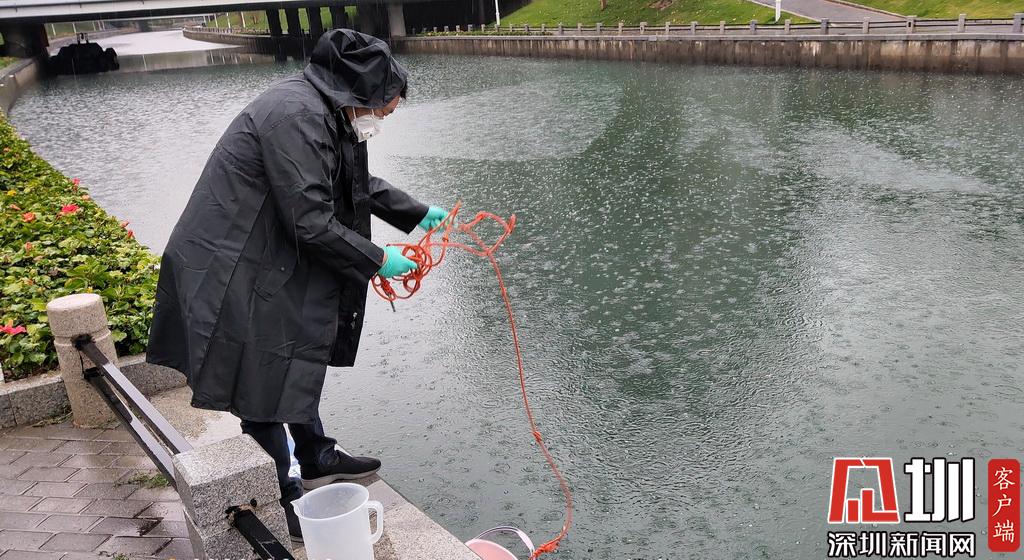 雨天,市環(huán)境監(jiān)測中心站的監(jiān)測人員在南山區(qū)大沙河取樣,進(jìn)行水質(zhì)監(jiān)測。