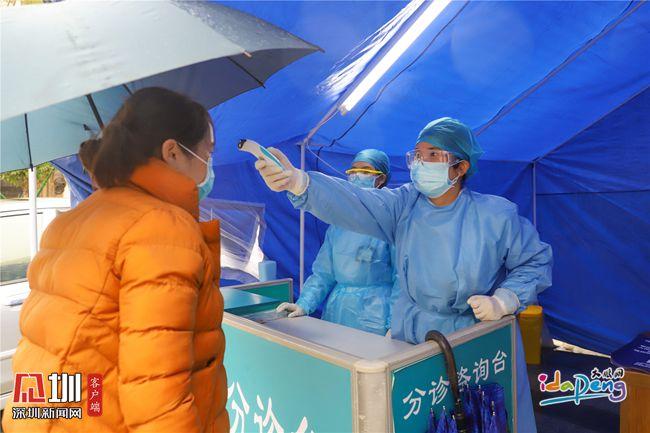 在葵涌人民醫(yī)院預檢分診處,護士為就診者檢測體溫。(見圳客戶端、深圳新聞網(wǎng)記者 黎陽 李小輝 通訊員 張莉)