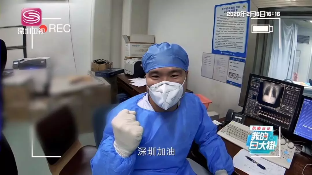 即便戴著口罩,還是能從她的語(yǔ)氣中聽(tīng)到洋溢著的幸福感。刷過(guò)醫(yī)院醫(yī)生專有的門禁卡,袁曉珊進(jìn)入老公的辦公區(qū)域。她老公叫黃茗勇,是深圳市第三人民醫(yī)院放射科技師。見(jiàn)到他時(shí),1米7左右的黃茗勇身上穿著藍(lán)色醫(yī)用防護(hù)服,臉上戴著白色醫(yī)用口罩?!斑@就是我老公?!痹瑫陨阂谎劬驼J(rèn)出來(lái)了。