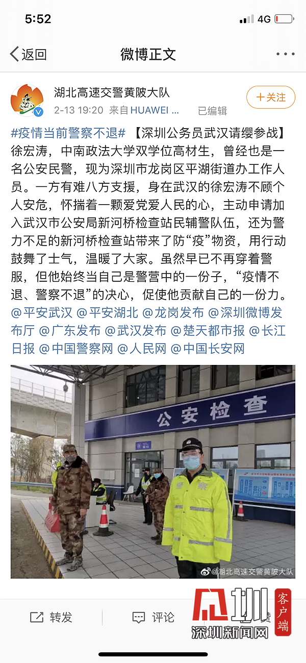 見(jiàn)圳客戶(hù)端、深圳新聞網(wǎng)2月16日訊(見(jiàn)圳客戶(hù)端、深圳新聞網(wǎng)記者 張凡 通訊員 李上彪 謝華庚)2月15日早上7點(diǎn),來(lái)自深圳市龍崗區(qū)平湖街道的黨員徐宏濤就站在了武漢新河公安檢查站的崗位上,開(kāi)始一天的志愿輔警工作。他是龍崗區(qū)平湖街道黨工委辦公室主任,因春節(jié)回家探親滯留武漢,這些天來(lái),他懷揣著一顆愛(ài)黨愛(ài)人民的心,主動(dòng)申請(qǐng)加入武漢市公安局新河檢查站民輔警隊(duì)伍,還為警力不足的檢查站帶來(lái)了防疫物資,他用行動(dòng)回報(bào)這片生于斯長(zhǎng)于斯的土地,更展現(xiàn)了一名龍崗優(yōu)秀黨員的擔(dān)當(dāng)與風(fēng)貌。