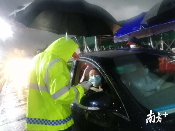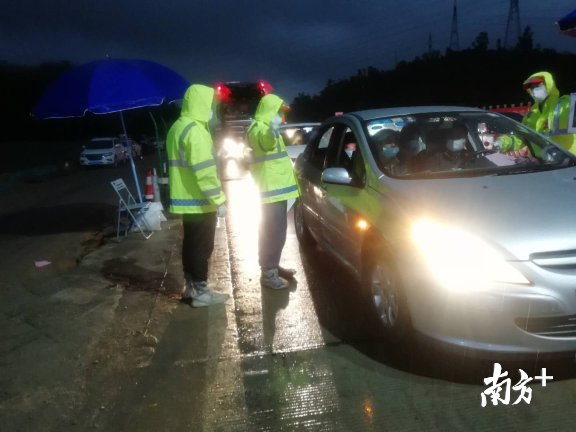 龍崗區(qū)坪地街道黨員干部和工作人員深夜冒雨開展疫情檢查?!?/p>