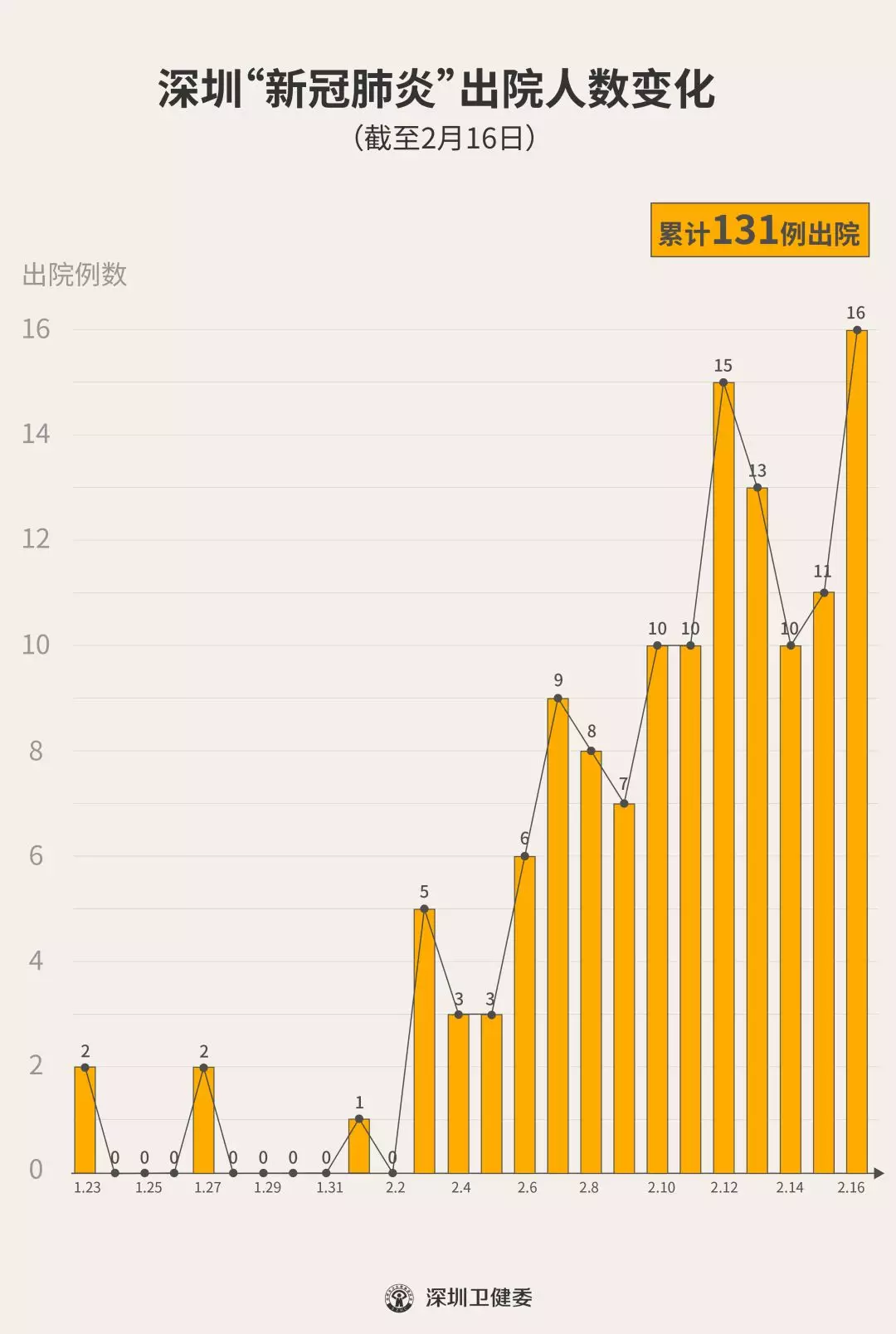 2月16日下午,經(jīng)專家組會診,深圳再有16名新型冠狀病毒肺炎確診患者出院,累計(jì)達(dá)131人,連續(xù)14天有人出院。