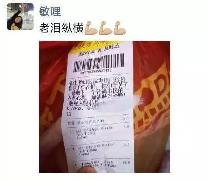 1月30日晚上8點56分,華中科技大學(xué)協(xié)和深圳醫(yī)院(南山醫(yī)院)手外科護士王敏在朋友圈曬了一張照片,照片里是一個紅色塑料袋上貼著一張外賣單,備注上寫著,“南山醫(yī)院發(fā)熱門診的醫(yī)務(wù)工作者們,你們辛苦了!請收下一個普通市民的一點點心意,加油,肺炎必?。 ?/p>