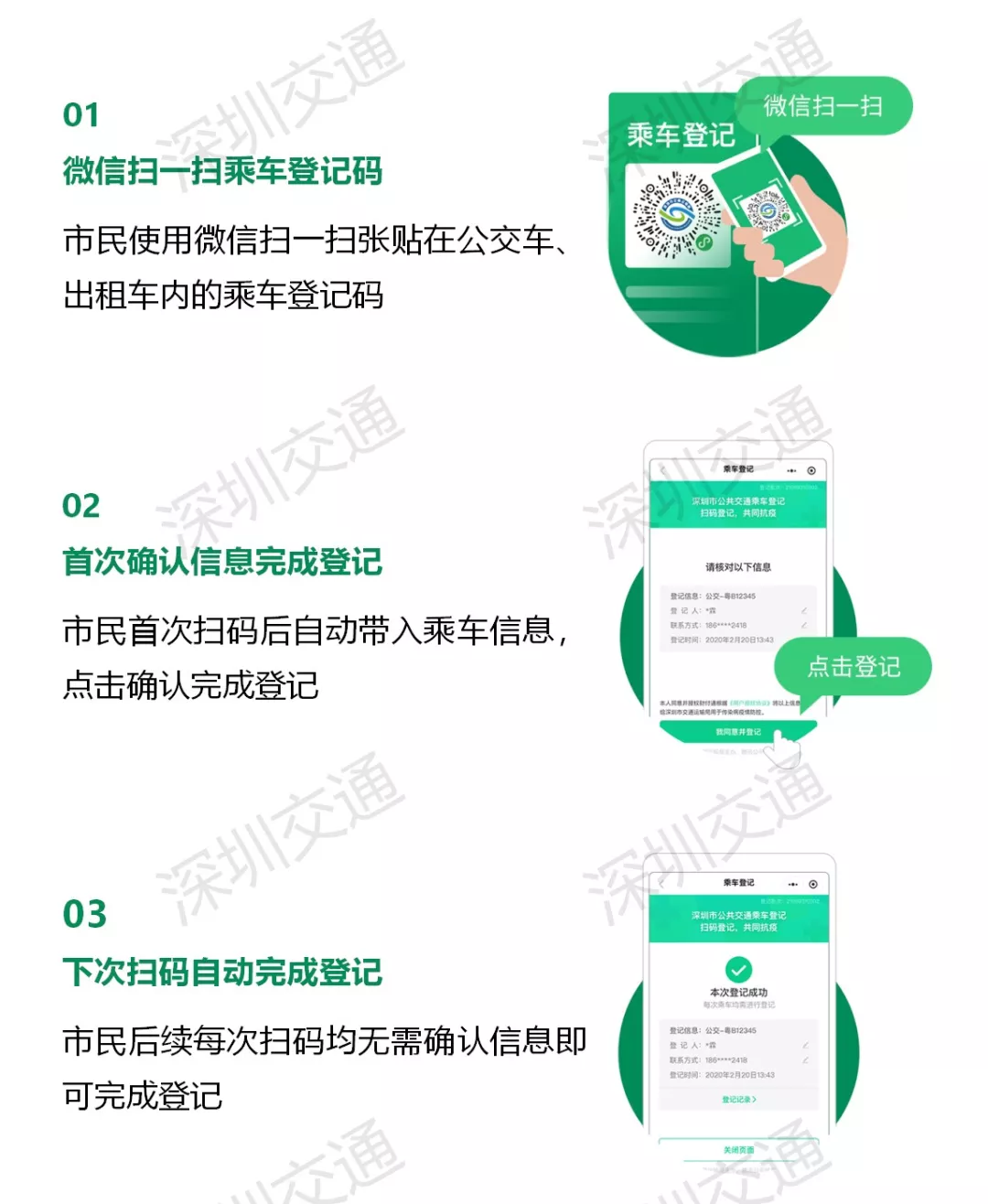 回答:深圳搭乘公交、出租車的市民請主動進(jìn)行乘車登記。同時,司乘人員也需每日進(jìn)行乘車登記。