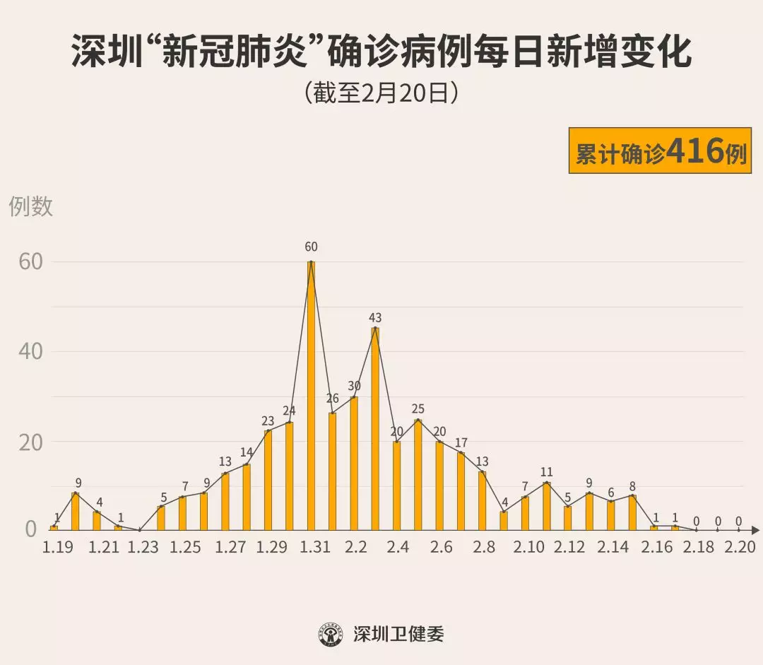 截至2月20日24時(shí),深圳累計(jì)報(bào)告“新冠肺炎”確診病例416例。2月20日當(dāng)天全市無新增確診病例。