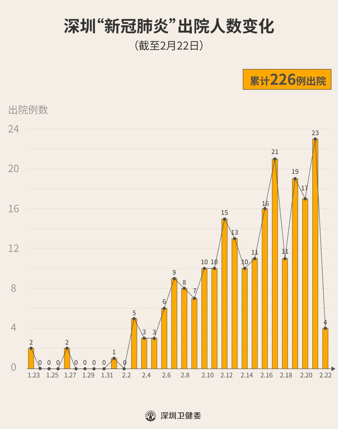 2月22日下午,經(jīng)專家組會(huì)診,深圳再有4名新型冠狀病毒肺炎確診患者出院,累計(jì)達(dá)226人,連續(xù)20天有人出院。