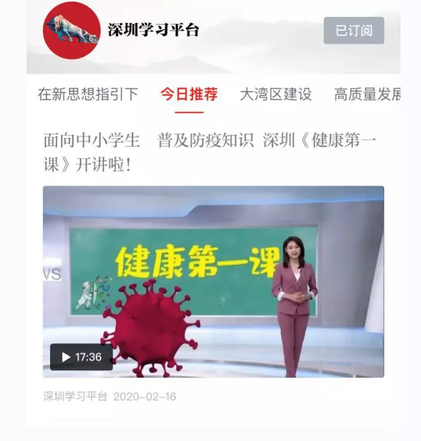 2月17日,“學(xué)習(xí)強(qiáng)國”深圳學(xué)習(xí)平臺編輯部和深圳市疾控中心聯(lián)合策劃推出的《健康第一課》節(jié)目在“學(xué)習(xí)強(qiáng)國”深圳學(xué)習(xí)平臺首發(fā),宣傳普及新型冠狀病毒肺炎防控知識,助力做好學(xué)校疫情防控工作,廣大學(xué)生家長積極收看,反響良好。