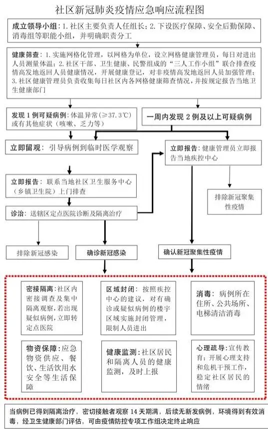 一、成立疫情應(yīng)急領(lǐng)導小組,建立保障機制。社區(qū)及各有關(guān)單位成立主要負責人任領(lǐng)導小組組長的新冠肺炎疫情應(yīng)急領(lǐng)導小組,下設(shè)醫(yī)療保障、安全后勤保障、消毒組等職能小組,并明確職責分工。