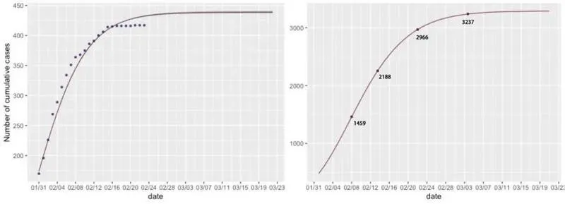 進一步地擬合深圳新冠肺炎的累計確診人數(shù),并對累計確診人數(shù)做出預(yù)測??梢钥吹剑P皖A(yù)測自2月28日起病例數(shù)不再增加,預(yù)測得到最終的累計確診人數(shù)收斂在422人左右。