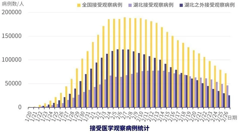 還值得關(guān)注的是正在接受醫(yī)學(xué)觀察的人數(shù),在全國嚴格管控的情況下,未來新增確診病例很大比例會來自這部分人群。從數(shù)據(jù)中可以看到,非湖北地區(qū)接受醫(yī)學(xué)觀察人數(shù)正在快速下降,湖北地區(qū)的也在穩(wěn)步下降中,這可能預(yù)示著未來新增確診病例也將下降。