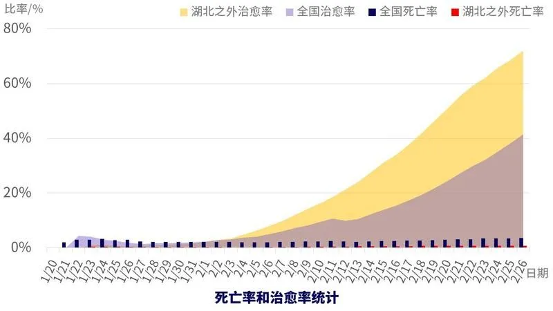 治愈率遠超死亡率。截至2月26日,非湖北地區(qū)治愈率已達72%,死亡率為0.8%。全國治愈率也在不斷提升,與死亡率之間的距離快速拉大,2月26日,全國治愈率41.4%,死亡率3.5%。