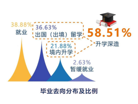 從本科畢業(yè)生升學情況來看,有超六成同學選擇了境外留學,其中四成為直博。在2019屆畢業(yè)生里,直博人數為144人,占全體畢業(yè)生近20%。