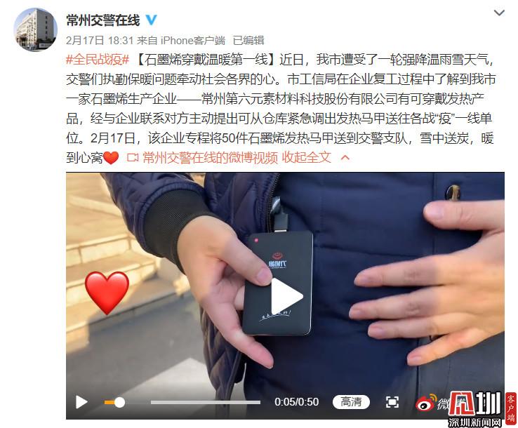 2月18日,一場大雪降臨常州,風(fēng)大雪大溫度低,常州各單位一線工作者堅守崗位,一如既往地扎實做好疫情防控工作。烯旺科技聯(lián)合兄弟企業(yè)常州第六元素向奮斗中在抗疫中執(zhí)勤一線的常州交警支隊,惠山區(qū)公安局、惠山經(jīng)濟(jì)開發(fā)區(qū)執(zhí)勤人員捐贈共計160件純石墨烯發(fā)熱馬甲,價值23.7萬元,以此向一線工作者送去溫暖,并致以崇高的敬意。