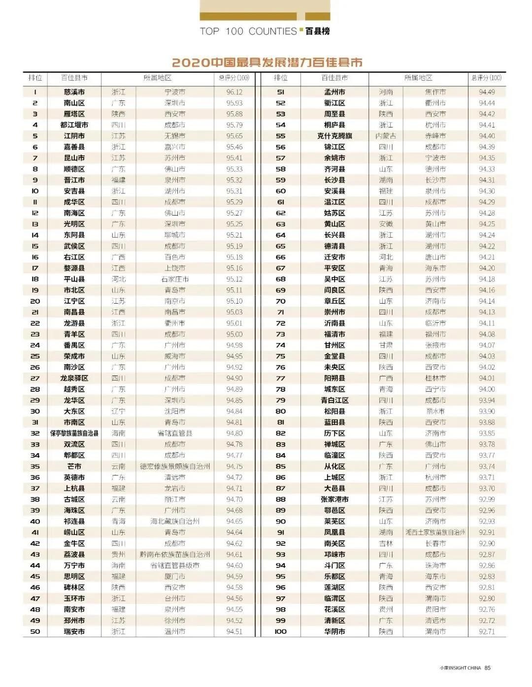 評選實(shí)際涵蓋全國2663個(gè)縣域行政單位(疫情發(fā)生地省份不參與)。榜單前十位中,廣東占有兩席,分別為深圳市南山區(qū)和佛山市順德區(qū)。南山區(qū)總分95.93分,其中特質(zhì)分為19.88,網(wǎng)絡(luò)分39.74、民意分16.54分、專家分19.77。