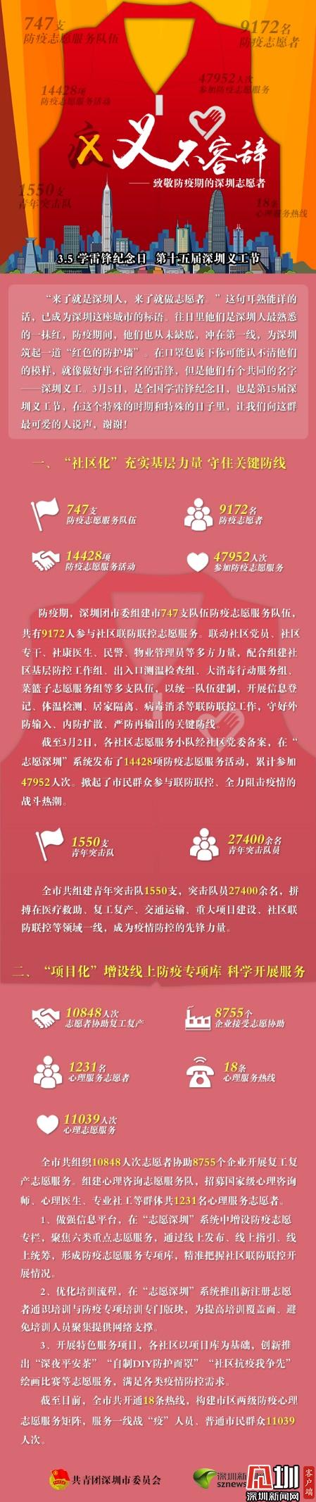 據(jù)了解,防疫期間,深圳團市委組建747支防疫志愿服務(wù)隊伍,共9172人參與社區(qū)聯(lián)防聯(lián)控志愿服。截至3月2日,各社區(qū)志愿服務(wù)小隊經(jīng)社區(qū)黨委備案,在“志愿深圳”系統(tǒng)發(fā)布了14428項防疫志愿服務(wù)活動,累計參加47952人次。在深圳戰(zhàn)“疫”的關(guān)鍵時刻,全市共組建青年突擊隊1550支,突擊隊員27400余人,拼搏在醫(yī)療救助、復(fù)工復(fù)產(chǎn)、交通運輸、重大項目建設(shè)、社區(qū)聯(lián)防聯(lián)控等領(lǐng)域一線,成為疫情防控的先鋒力量。
