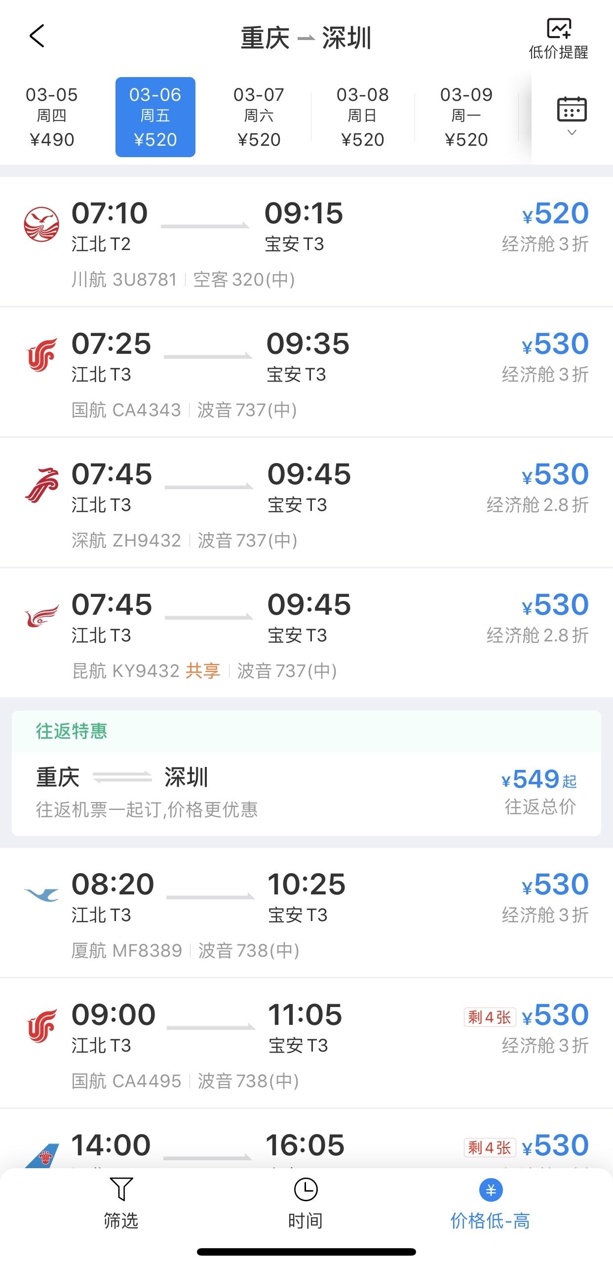 記者留意到,這些低價(jià)機(jī)票基本是某一航線從深圳出發(fā)的單程情況,而其返程回深的票價(jià)則要高出許多,如從重慶、成都、鄭州、西安等地飛深圳的大部分航線,其3月的票價(jià)為500多元。