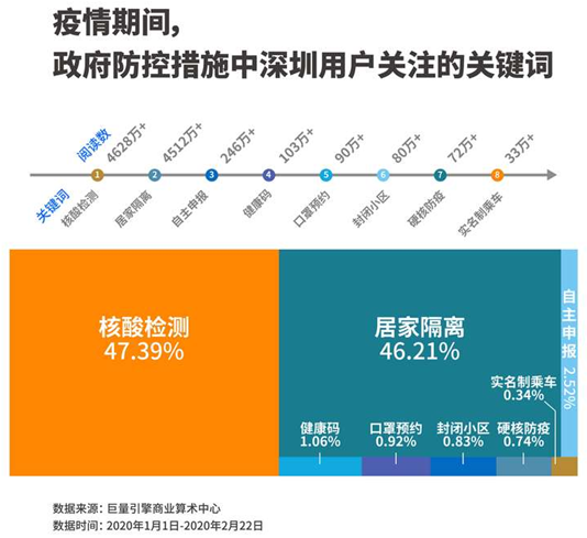 深圳市的具體防控舉措也被今日頭條深圳區(qū)域用戶高頻關注。數據顯示,免費的核酸檢測關注度排名第一,閱讀數達到4628萬次。為了防范病毒的社區(qū)傳播,2月12日起,深圳市對于居家隔離觀察人員全面展開了病毒免費合作檢測工作。隔離者的確定集合了街道的逐戶排查和住戶的自主申報,結合住戶的行程軌跡,最大程度避免遺漏。