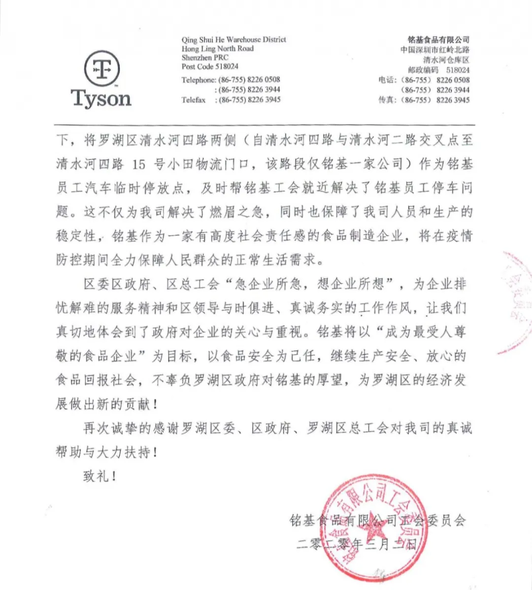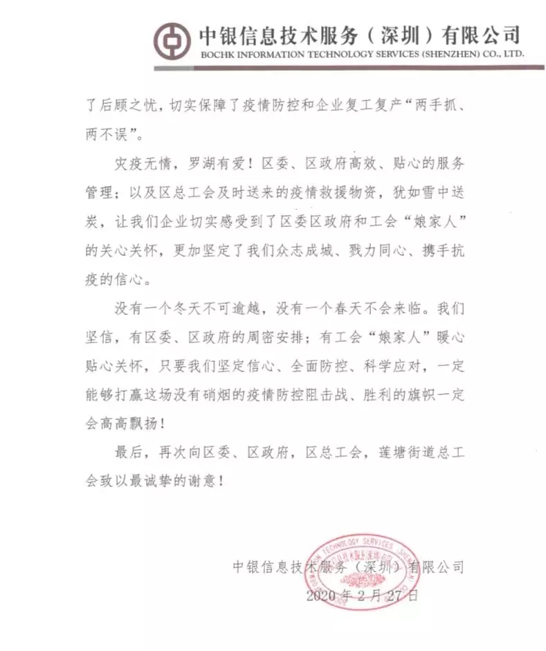 中銀信息技術服務(深圳)有限公司、銘基食品有限公司在復工復產(chǎn)后都遇到了一些困難,羅湖工會了解了他們的情況后,主動發(fā)揮工會作用,幫企業(yè)解決困難,協(xié)助他們順利復工復產(chǎn)。近日,兩封感謝信送到了羅湖區(qū)委、區(qū)政府,向羅湖羅湖區(qū)委、區(qū)政府以及羅湖各級工會為企業(yè)的付出表示感謝。