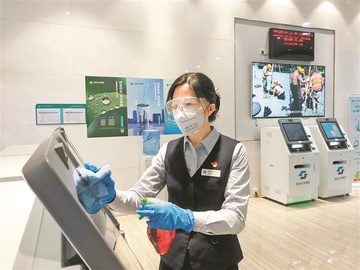深圳水務集團福田分公司福田營業(yè)廳的楊麗娜,正對自動服務機進行消毒。