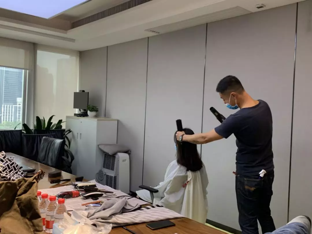 公司本部,1303會議室,臨時理發(fā)室“生意”也火爆極了。公司工會邀請了兩名專業(yè)的Tony老師,為近90名員工提供免費的理發(fā)服務(wù)。為減少人員聚集,理發(fā)采取提前線上預(yù)約,分時段進(jìn)行,確保安全的同時,盡可能讓有需要的同事都能理上發(fā)。鋪上一次性地毯,坐上椅子,圍上一次性“斗篷”,Tony老師一頓熟練的剪發(fā)操作后,再用吹風(fēng)機整好造型,就完成了理發(fā)的全過程。臨時理發(fā)師的搭建,有效解決了員工生活上的困難,幫助他們以良好的精神面貌投入工作來。