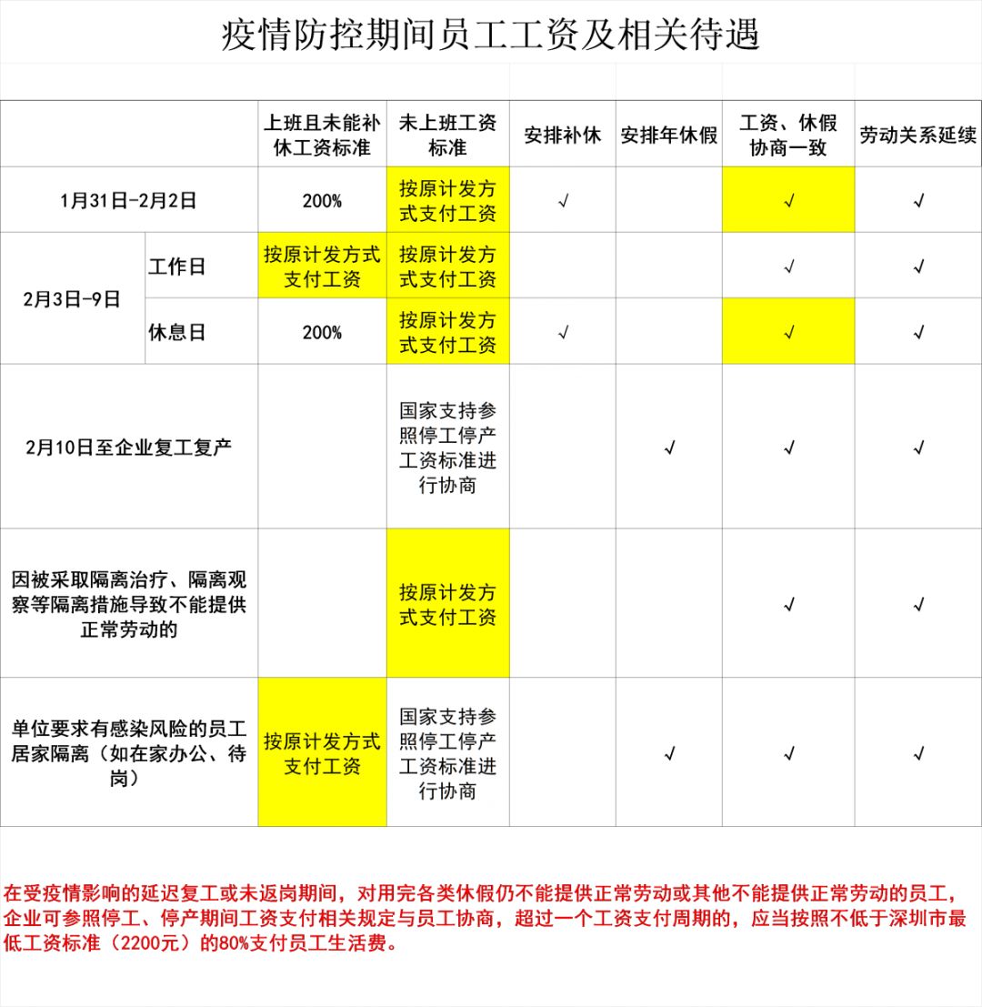 在2月3日至9日(廣東省延遲復(fù)工期間),未復(fù)工的,企業(yè)按照勞動(dòng)合同約定的標(biāo)準(zhǔn)支付工資;安排職工工作的,應(yīng)當(dāng)依法支付工資。其中,企業(yè)在休息日安排工作又不能安排補(bǔ)休的,按照不低于職工本人日或小時(shí)工資標(biāo)準(zhǔn)的200%支付工資。