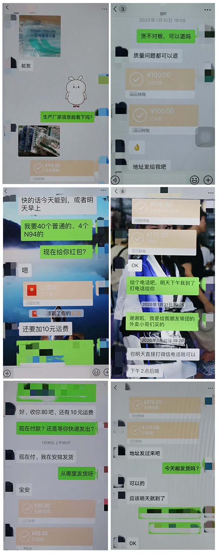 此前李小姐在某社區(qū)賣(mài)菜群里,看到了一名群友發(fā)布“口罩資源”的信息,于是加其為好友,對(duì)方向李小姐展示了售賣(mài)資質(zhì)以及售賣(mài)口罩的樣品,一步步讓李小姐放松了警惕,雙方以1.75元/個(gè)醫(yī)用口罩、9元/個(gè)N94口罩的價(jià)格談妥交易。