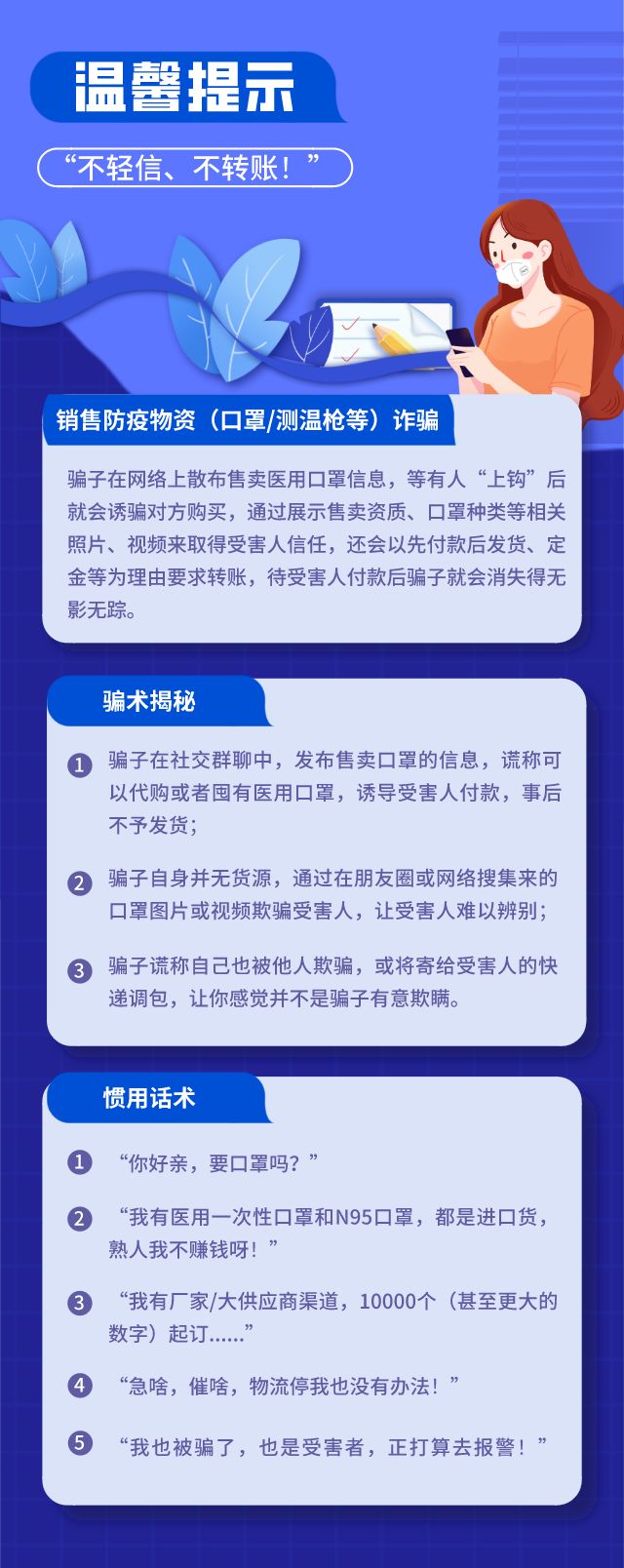 疫情期間,不少企業(yè)和個(gè)人紛紛采購(gòu)口罩等防護(hù)用品。針對(duì)利用口罩等防疫物資實(shí)施詐騙等違法犯罪行為的不法分子,福田警方堅(jiān)決從嚴(yán)從快依法打擊。廣大市民謹(jǐn)記,購(gòu)買(mǎi)口罩、消毒液等防疫物資,要通過(guò)正規(guī)途徑,做到“不輕信、不轉(zhuǎn)賬”,避免上當(dāng)受騙。
