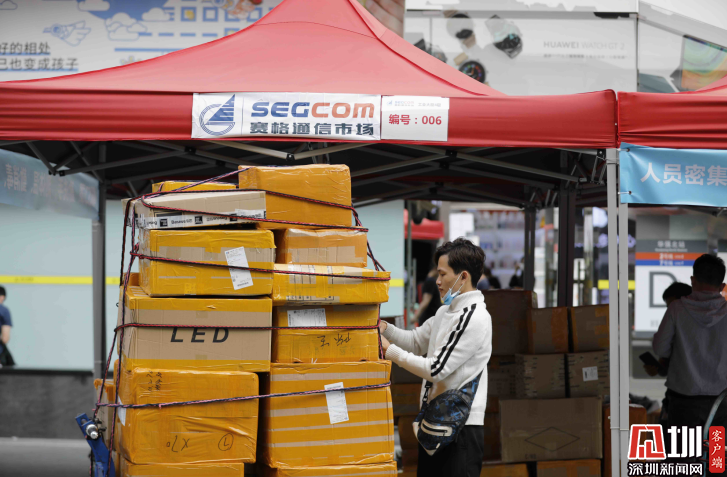 華強(qiáng)北步行街的臨時帳篷旁邊,一位從業(yè)者正在整理貨物。
