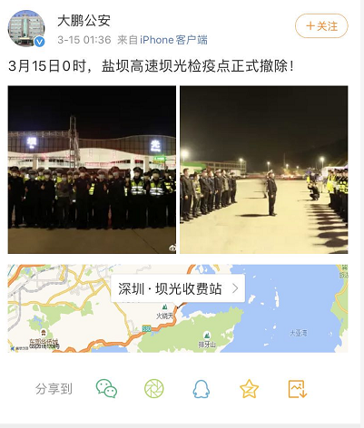 3月15日,深圳撤銷全部49個入深車輛道路交通聯合檢疫點,各條入深道路恢復正常通行。