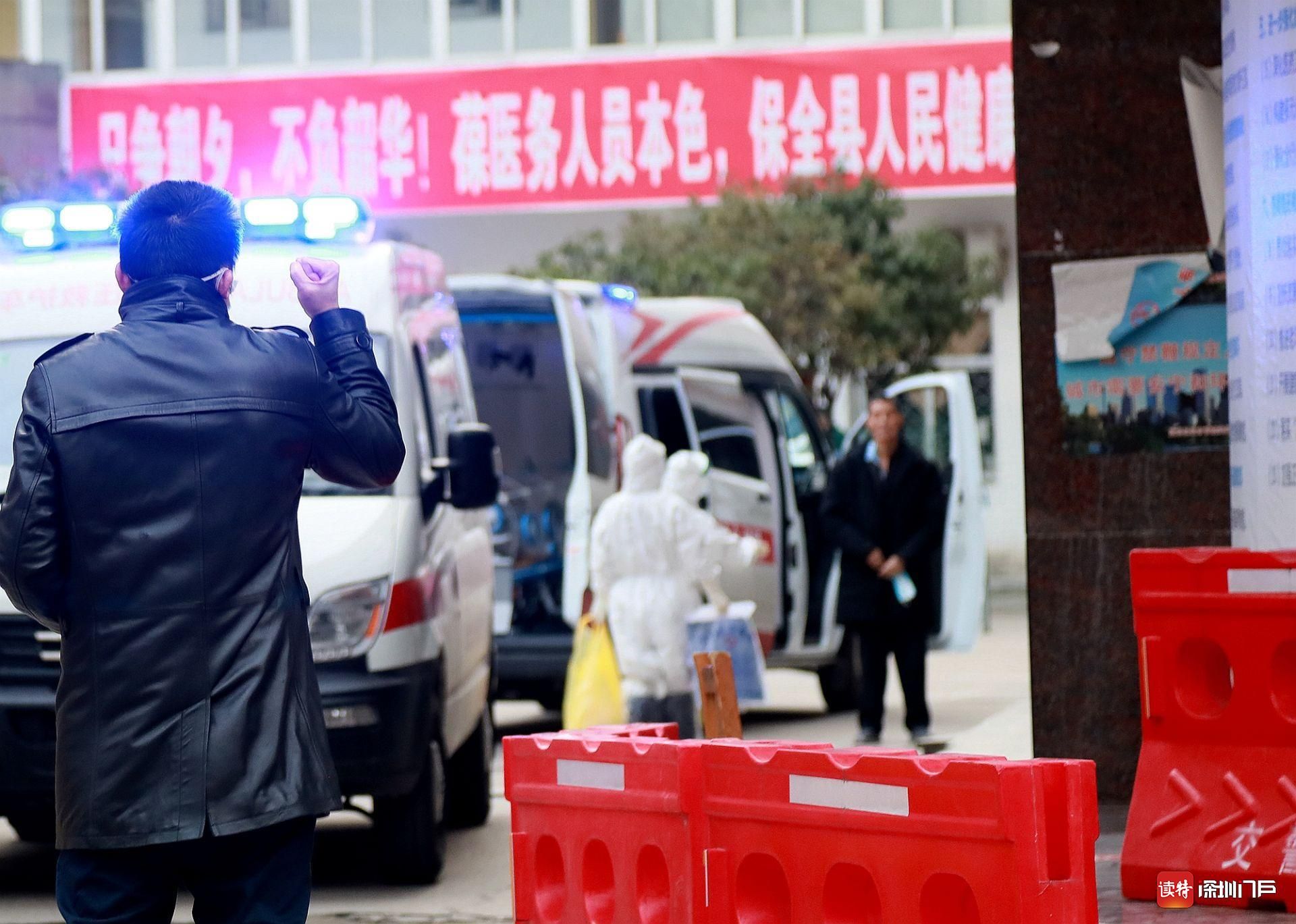 2月29日,監(jiān)利縣中醫(yī)院,一位重癥患者即將轉(zhuǎn)往荊州救治。患者的兒子聞?dòng)嵹s來,遠(yuǎn)遠(yuǎn)地向父親舉起拳頭,高喊“加油”。