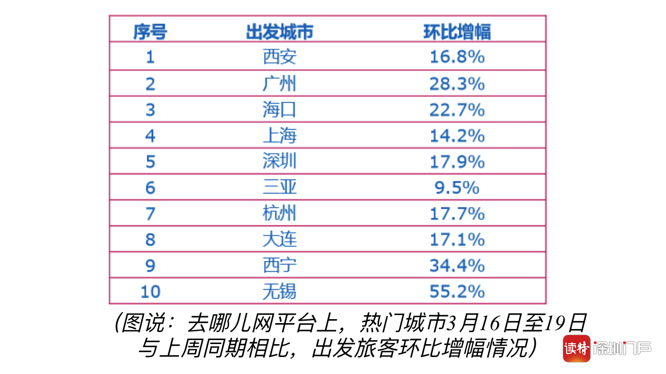 深圳特區(qū)報2020年3月19日訊 進(jìn)入3月中旬,隨著各地有序復(fù)工復(fù)產(chǎn),旅游行業(yè)也出現(xiàn)回暖跡象。去哪兒網(wǎng)數(shù)據(jù)顯示,本周五一假期搜索量環(huán)比上周增長76%。